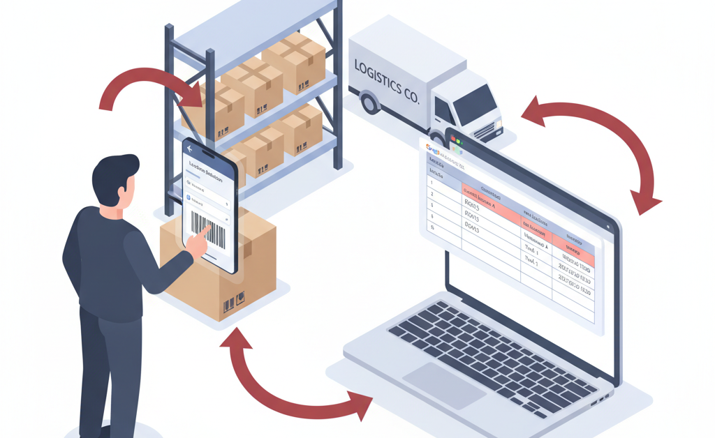 Here’s how the workflow operates. When a worker scans an item barcode, the app looks up the item’s current location in a Google Sheet. The worker then confirms the new destination location. The system automatically updates the spreadsheet by marking the item as “out” from its previous location and “in” at the new location, all with a single scan.